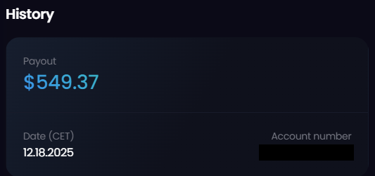 I purchased my first challenge on October 14, 2025, and received a payout of 549 USD on December 18. This is my only payout from Bright Funded so far, but I currently hold two 100k funded accounts and expect to receive significant payouts this year. I will continue to update this page with the results. Their support is also very fast and thorough.