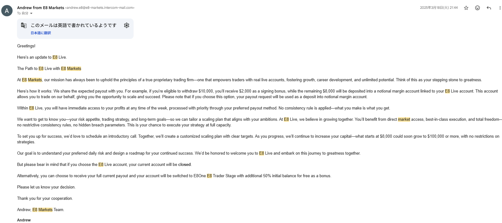 I am not currently using E8 Markets because they no longer offer a plan with a static maximum drawdown. However, their support has always been polite and genuinely kind, and I have never had any problems with payouts. If they introduce a plan that suits my style, I will certainly use them again.
